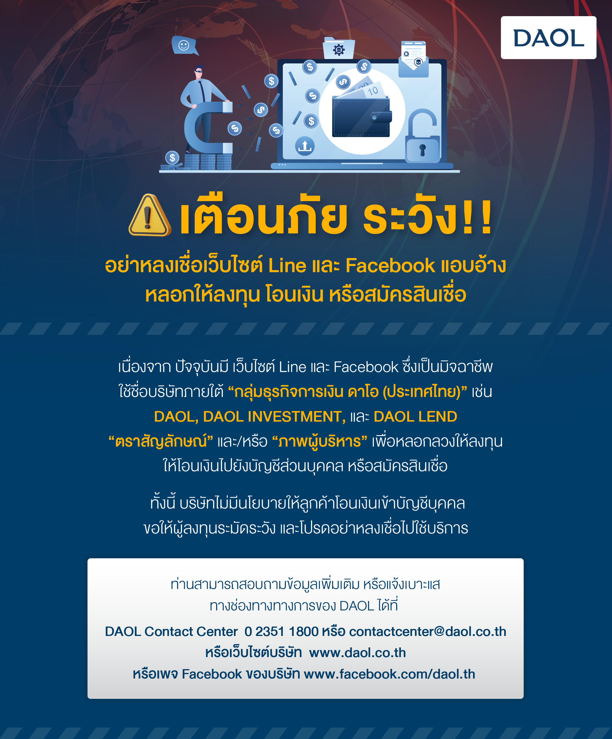 เตือนภัย ระวัง !! อย่าหลงเชื่อมิจฉาชีพแอบอ้างใช้ชื่อ "บริษัทภายใต้กลุ่มธุรกิจการเงิน ดาโอ (ประเทศไทย)"